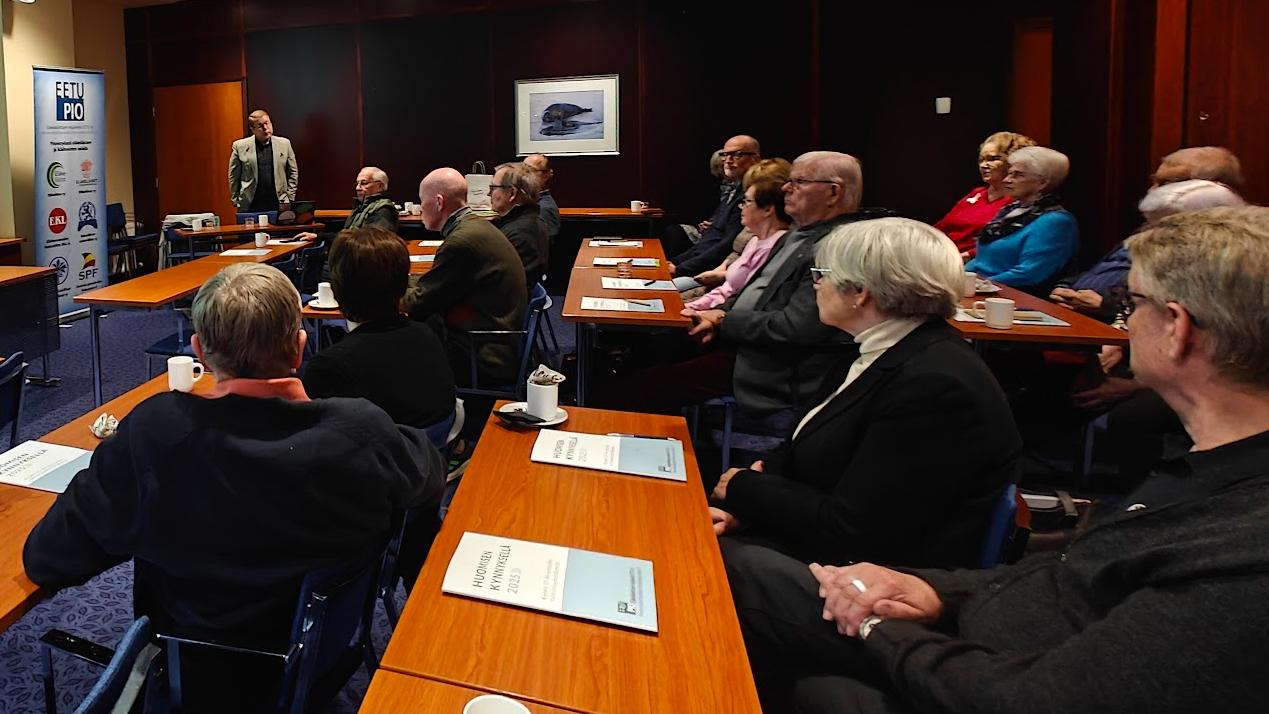 EETU ry:n alueellinen eläkeläisparlamentti kokoontui 29.10.2025 Mikkelissä. Paikalla oli yhteensä 24 osallistujaa neljästä Etelä-Savon eläkeläisjärjestöstä. Ilahduttavaa oli, että heistä peräti puolet edusti oman senioripiirimme yhdistyksiä. Se osoittaa aktiivista kiinnostustamme vaikuttamistyöhön. Eloisan toimialajohtaja Niina Kaukonen piti erinomaisen esitelmän ikääntyneiden palveluista. EETU:n puheenvuorossa Eläkkeensaajien Keskusliiton puheenjohtaja Ilkka Kantola esitteli Huomisen kynnyksellä 2025 -raportin, joka käsitteli 55–84 vuotiaille tehdyn kyselyn tuloksia tulevaisuuden näkymistä.