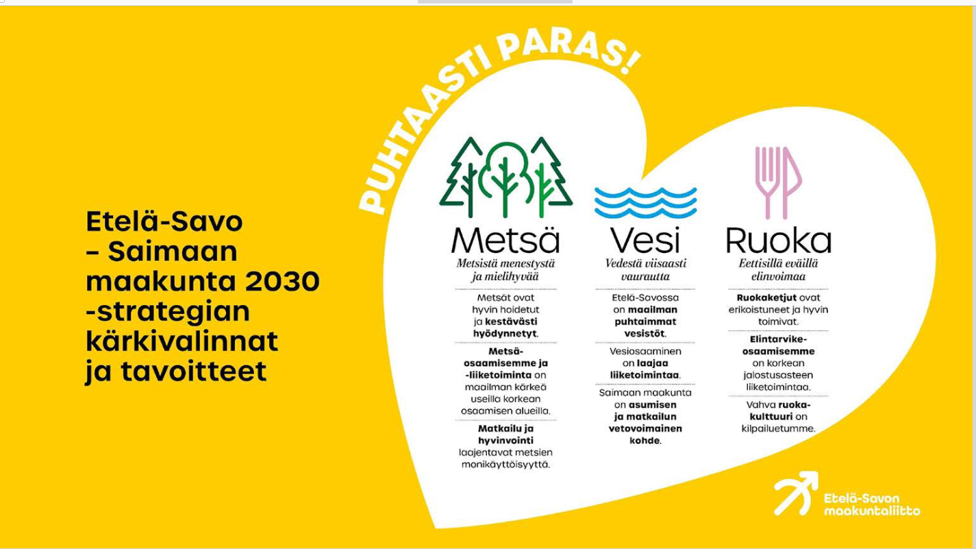 Esittelykuvista selvisi muun muassa se, että Etelä-Savo on omavarainen ruoantuotannossa, vedessä ja metsässä. Strategia on luotu näistä lähtökohdista ja niiden varaan myös savolainen elämänmuotokin on rakentunut, kuten sivupalkin kuvista on luettavissa.